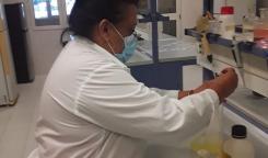 Técnica del laboratorio realiza determinación del porciento de actividad del hipoclorito de