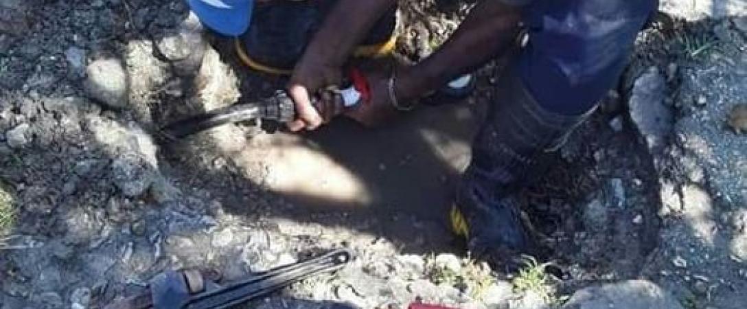 Base de Metraje elimina salidero en la conexión del metro contador en calle Primelles 643 e/ Vía Blanca y Fomento Consejo Popular Palatino, municipio Cerro.