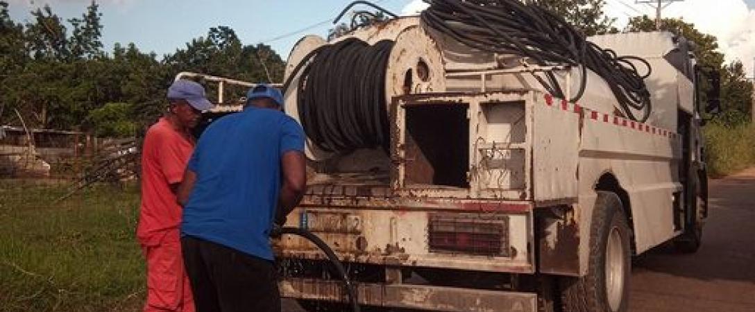 Carro especializado de la Base de Saneamiento Oeste realiza mantenimiento correctivo al sistema de alcantarillado en, calle 105 e/ 28 y 32 Reparto Sierra Maestra, Consejo Popular Nuevo Santiago, municipio Boyeros.
