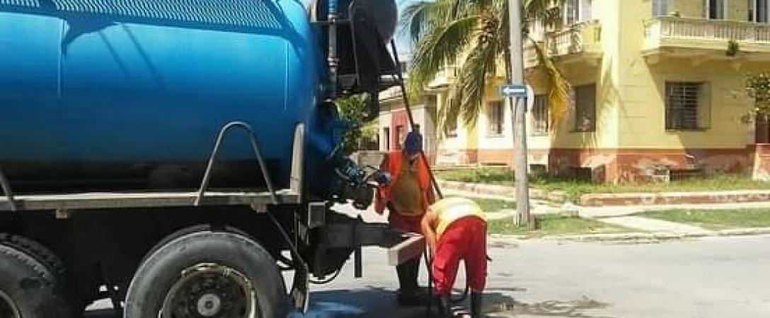 Base Saneamiento Oeste trabaja con carro de alta presión en calle 9na y H, Consejo Popular Rampa, municipio Plaza.