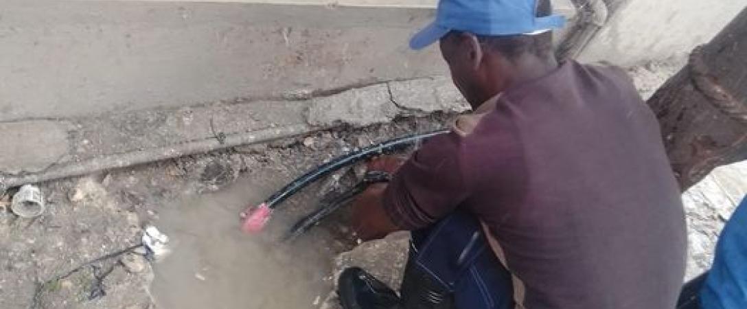 Brigada de la Base de Acueducto Centro, trabaja en la supresión de salidero en calle Mango en el Consejo Popular Jesús del Monte, municipio10 de Octubre.