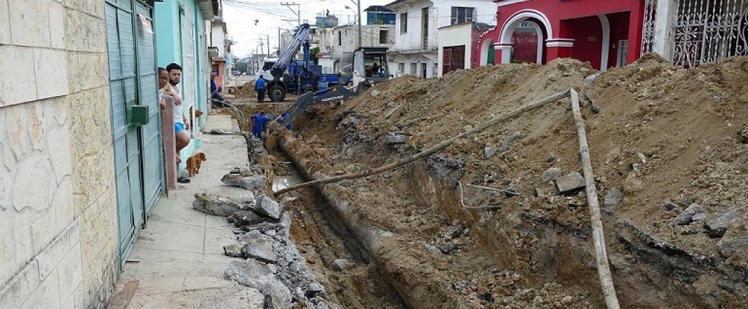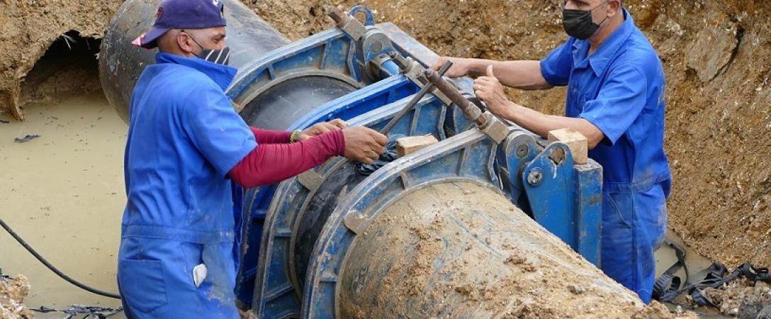 Brigada de la Base de Construcciones Hidráulicas trabaja para solucionar la avería en el tubo de 24 pulgadas en la conductora Marino Palatino en el municipio Cerro.