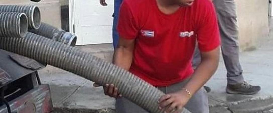 Brigada de la Base de Saneamiento realiza mantenimiento a la línea de alcantarillado de la calle Dragones, Consejo Popular Los Sitios, municipio Centro Habana.