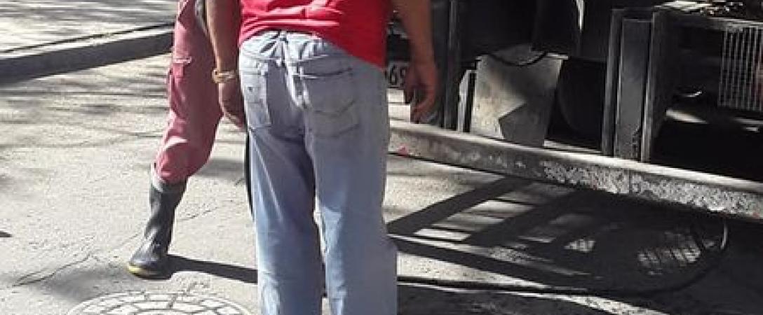 Brigada de la Base de Saneamiento Centro trabaja con carro de alta presión en la desobstrucción del registro 24 en calle Jovellar del Consejo Popular Cayo Hueso, municipio Centro Habana.