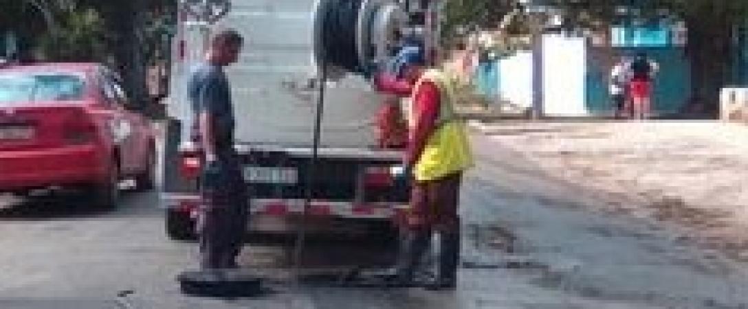 Brigada de la Base de Saneamiento Centro trabaja en la limpieza de registro con carro de alta presión, en calle 19 entre F y G, en el Consejo Popular Vedado, municipio Plaza de la Revolución.