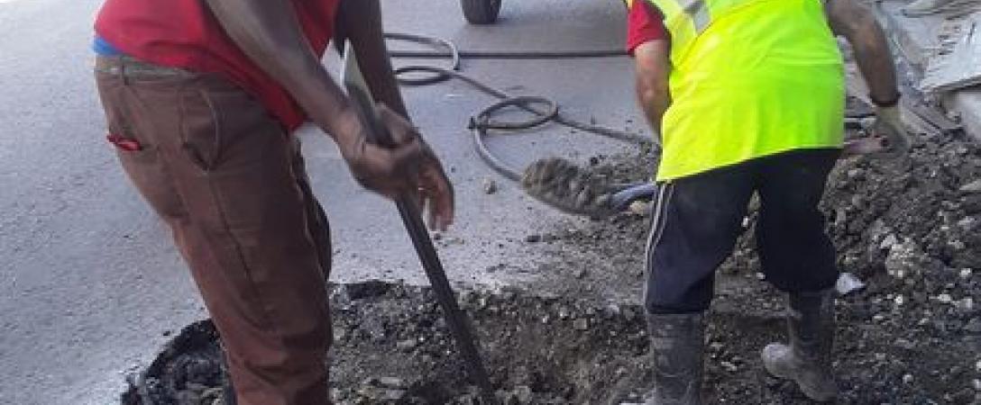 Brigada de la Base de Saneamiento Centro trabaja en la reparación de entronque de alcantarillado en calle Reina #213, el Consejo Popular Los Sitios, municipio Centro Habana.