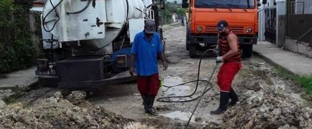 Brigada de la Base de Saneamiento del Este trabaja en mantenimiento y reparación de redes en calle 28 entre 65 y 67, Consejo Popular Magdalena, municipio Cotorro.