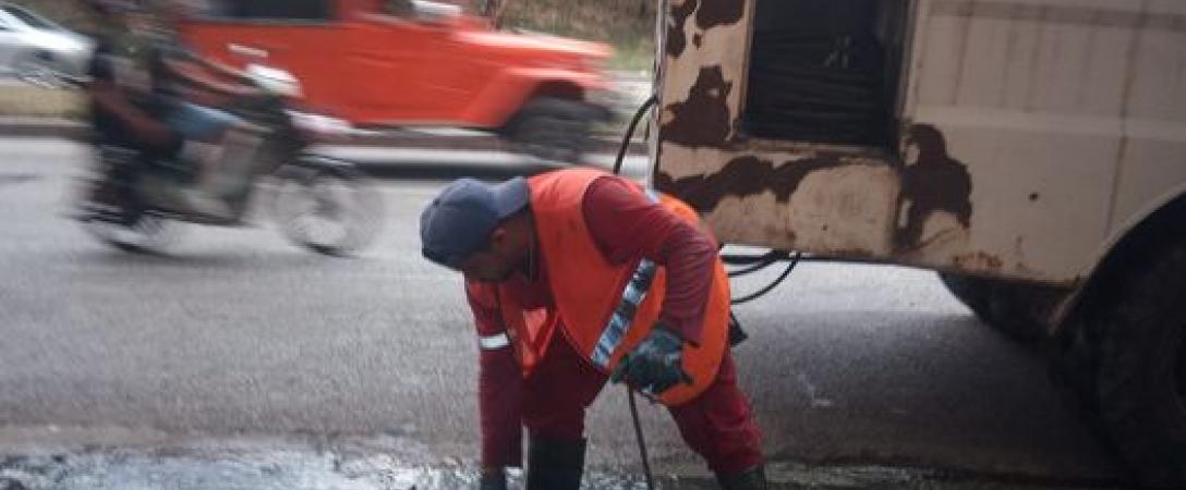 Brigada de la Base de Saneamiento Oeste trabaja con carro de alta presión para minimizar los vertimientos en Avenida Carlos Manuel de Céspedes y San Pedro, Consejo Popular Plaza.
