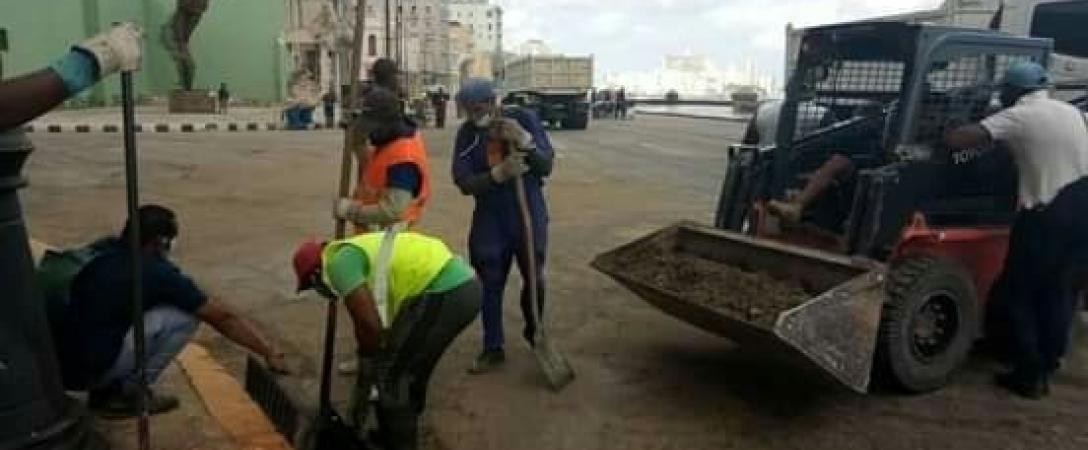 Brigada de la Base Saneamiento Centro realiza mantenimiento al sistema de drenaje pluvial en la calle Malecón, Consejo Popular Dragones, municipio Centro Habana.