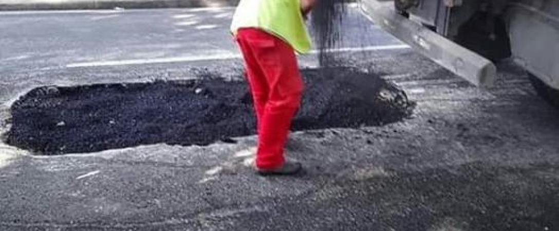 Brigada de obra civil de la Base Saneamiento Oeste asfaltando después de quedar reparada la línea central de alcantarillado en, calle Paseo e/ 11 y 13, Consejo Popular Vedado Malecón, municipio Plaza.