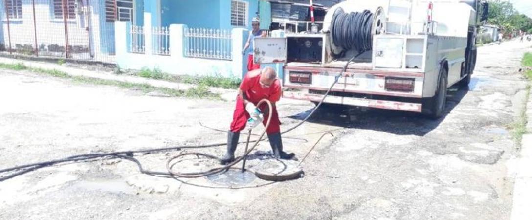 Brigada de Saneamiento Este realiza desosbtrucción con carro especializado en el vertimiento de calle 48, Consejo Popular Lotería, muncipio Cotorro.