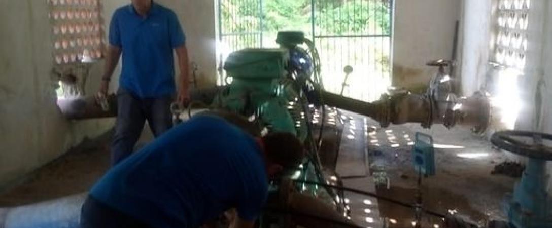 Especialistas de la Subdirección de Mantenimiento Mecánico comprueban el funcionamiento del impulsor Loma del Cielo que abastece parte del municipio San Miguel del Padrón.