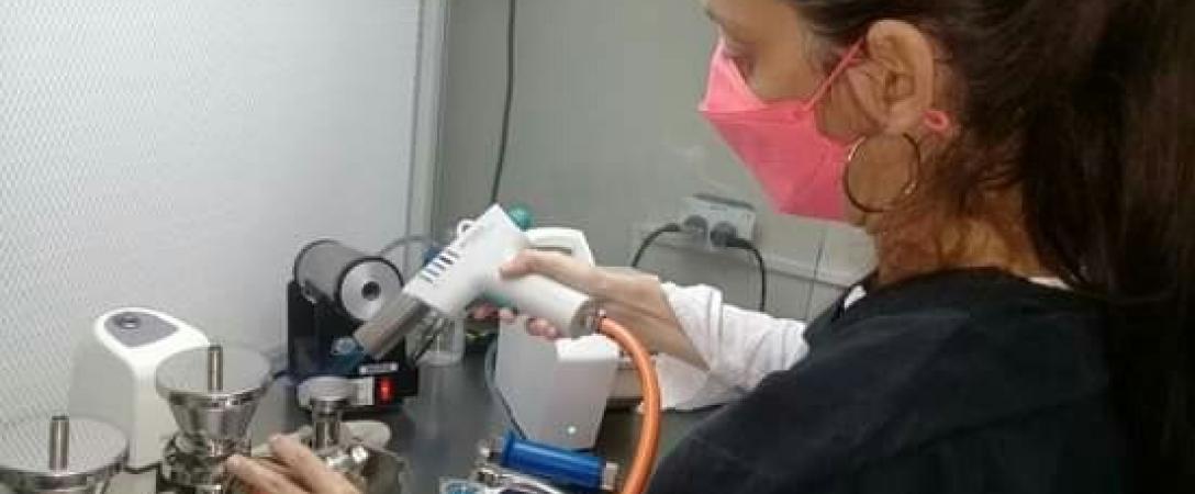 Técnica del laboratorio realiza flameado a la rampa de filtración, para su posterior uso en la técnica de filtración por membrana para la determinar la calidad bacteriológica del agua potable.